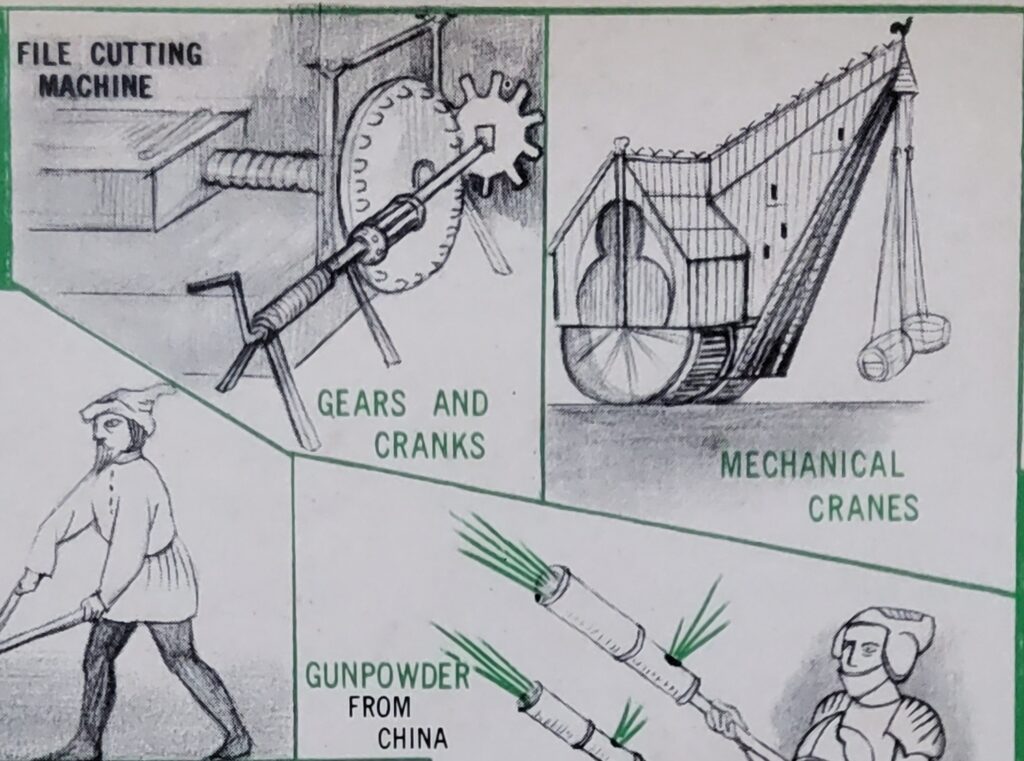The Moslems brought the knowledge of three great Chinese inventions to Europe. Gunpowder has been referred to, as coming into use about the time of the Hundred Years’ War. The magnetic compass helped to make modern navigation possible. The introduction of paper was tremendously important. Papyrus had disappeared from use in Europe, early in the Middle Ages and manuscript books were being written on prepared sheepskin, called parchment. Parchment was expensive and restricted, the quantity of books produced.