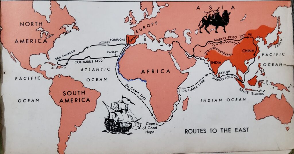 To most people, this was a wildly imaginative tale. Nevertheless, some of his readers, like Christopher Columbus, regarded the book as a true account of countries like China, Japan, Tibet, Ceylon, Siam and Java. They, too, wanted to visit “Cathay” and “Cipangu.” Geography written in Spain about 1350 A. D., indicates that the Canary Islands were known and that the Azores had been explored. Once mariners had entered the Atlantic, efforts to find new places and new routes were made. In 1484, the Portuguese explorer Diaz, sailed around the Cape of Good Hope. The most significant discovery of the time was that of Christopher Columbus, who in 1492, reached an island he named San Salvador, in the West Indies. In 1498, Vasco da Gama sailed around the Cape of Good Hope and reached India. Thus by 1500 A. D., the Western Hemisphere had been discovered and a new way to reach the Orient had been found.