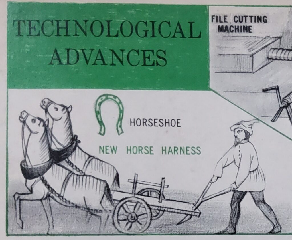 That may sound like overstatement, but look at the inventions in question. In ancient times, a horse pulling a load was choked by his harness. In the tenth century, Europeans invented the horse collar, a piece of harness by which the weight of pulling was thrown on a horse’s shoulders instead of his neck. It is said that this arrangement gave the horse four times the pulling power previously achieved. The horseshoe was created, providing protection for a horse’s hoofs and giving him better traction. This invention has been compared in economic importance, to the invention of the rubber tire in the automobile age. A third invention of this period was a tandem harness, which permitted the hitching of horses in tandem.