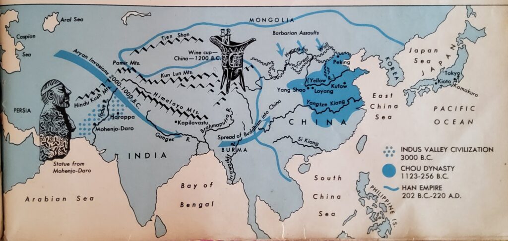 Shih Huang Ti’s death was followed by civil war and a new dynasty of rulers, known as the Han Dynasty. The greatest Han ruler was Wu Ti, who ruled from B. C. 140 to 87. Wu Ti brought Korea, Manchuria, Turkestan and Indo-China into his empire. He also sent troops against barbarians who were pounding at the Great Wall and defeated them. Their defeat made safe the caravan routes to the West and eventually opened up trade with central Asia and the eastern sections of the Roman Empire.