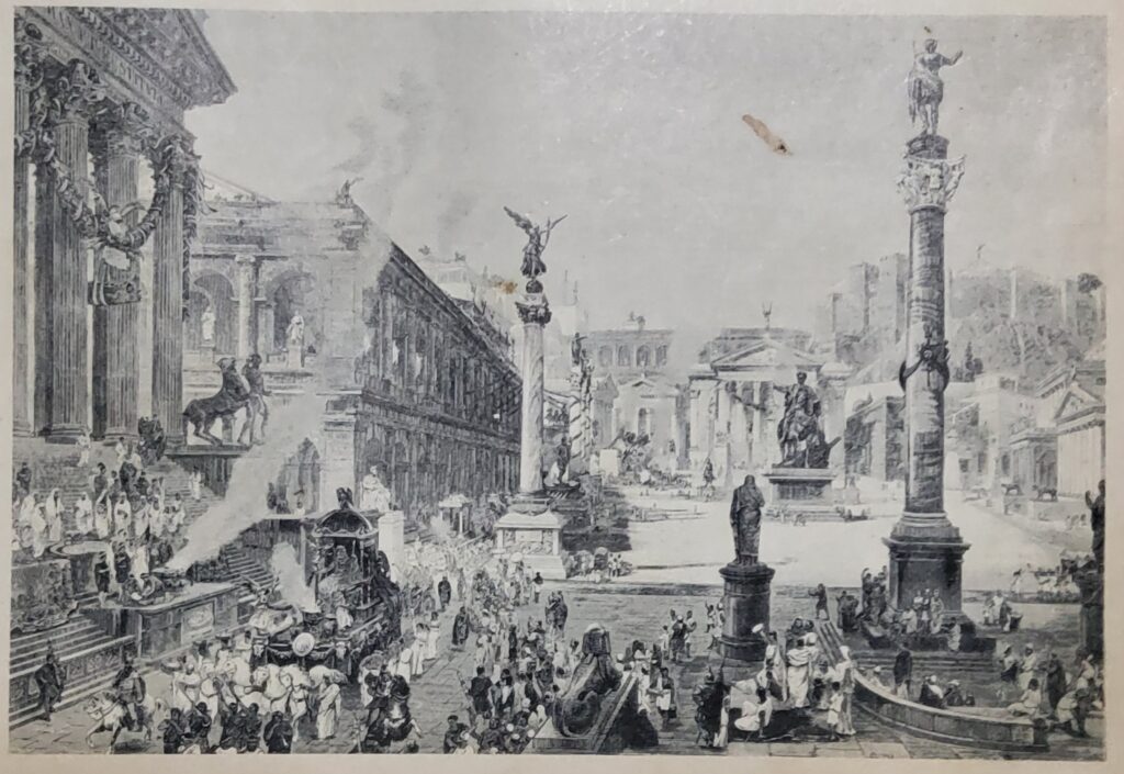 One of these nomadic tribes, the Latins, finally settled south of the Tiber River in an area which came to be called the plain of Latium. Modern scholars believe that some of the tiny Latin settlements united, chose a common market or meeting place, the Forum and so laid the foundation, of the city of Rome. About B. C., 800 the Etruscans, a people who probably came from Asia Minor, appeared in Italy. They settled north of Latium, whereas the Greeks had established their colonies in southern Italy.